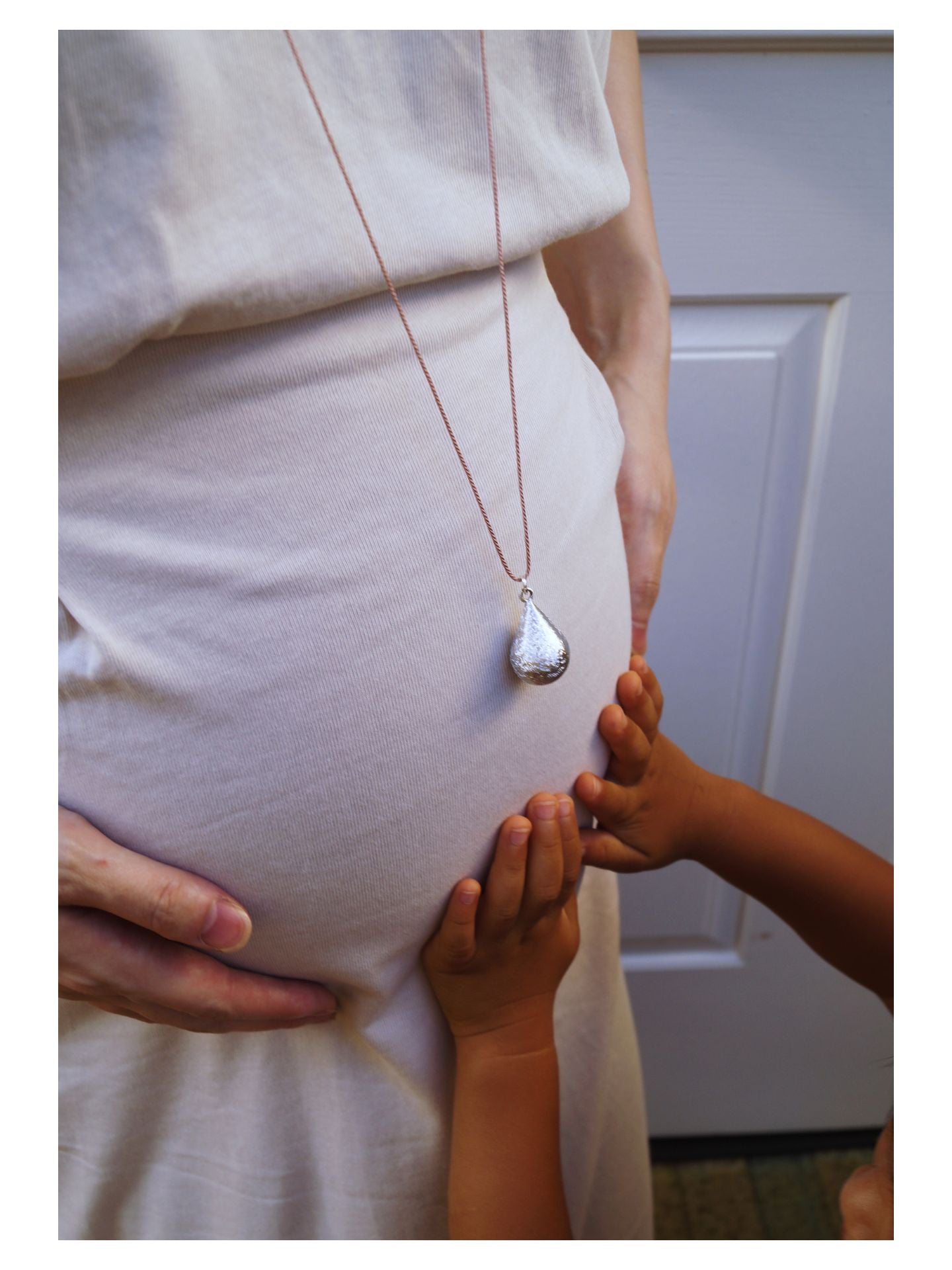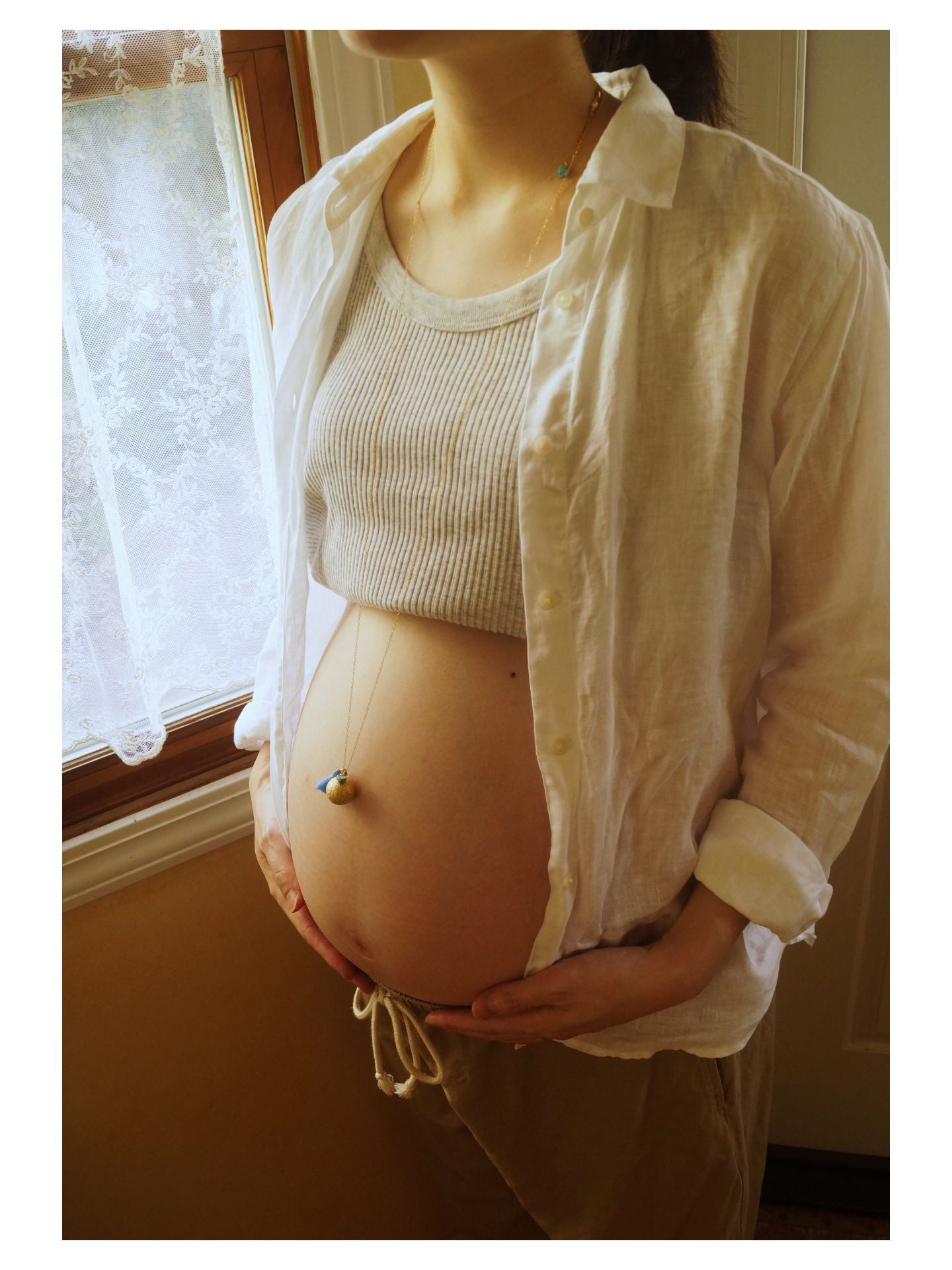 ネックレスは、服の下で肌に近く着けて赤ちゃんとの絆を感じたり、服の上に着けてお腹の丸みを美しく見せることもできます。エレガントで快適なデザインです。